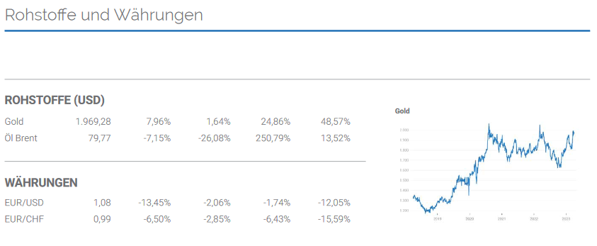 Die leicht positiv veränderte globale BIP-Prognose war verbunden mit vermindertem Preisdruck. So sank der CRB-Rohstoffpreisindex im ersten Quartal 2023 von 298 auf 279 Punkte und markierte das tiefste Niveau seit Februar 2022. Die Themen Versorgungssicherheit mit Energie und Rohstoffen als auch deren Preise belasteten tendenziell weniger. Das Situationsmanagement insbesondere in Europa war und ist zunächst erfolgreich. Damit sanken die von außen auf die Wirtschaftsräume wirkenden Inflationseinflüsse. Dagegen steigt über die aktuellen Lohnforderungen potentiell der innere Inflationsdruck.  Die Öffnung Chinas mit dem Ausstieg aus der Corona-Politik lieferte einen positiven Impuls für die Wirtschaftsaussichten Chinas und der Weltwirtschaft auch im Hinblick auf potentiell verringerte Lieferkettenprobleme und damit diesbezüglich verringerten Inflationsdrucks. Der IWF setzte die BIP-Prognose Chinas um 0,8 % per 2023 auf 5,2 % in die Höhe. Goldman Sachs erhöhte im März 2023 die BIP-Prognose per 2023 auf 6,0 %.
